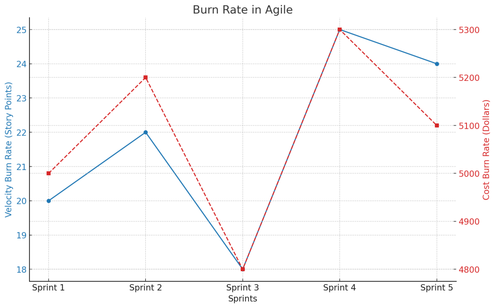 • Cost Burn Rate: $5000, $5200, $4800, $5300, $5100 spent per sprint