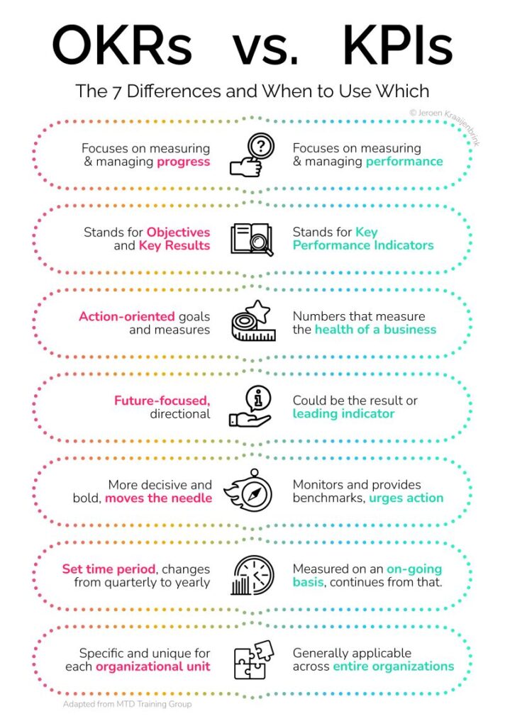 - KPIs are more focused on specific metrics and data points, while OKRs are broader and more strategic in nature.
