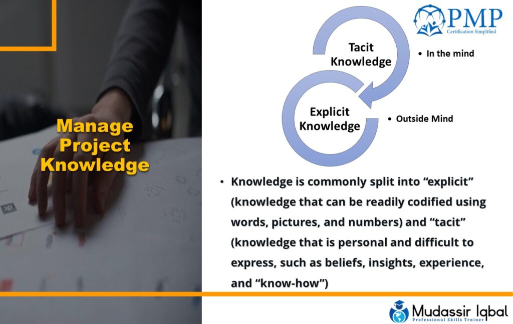 Tacit knowledge is personal whereas Explicit knowledge can be expressed using words or pictures.