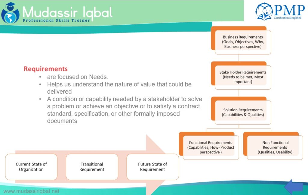 “a condition or capability that is required to be present in a product, service, or result to satisfy a business need.”