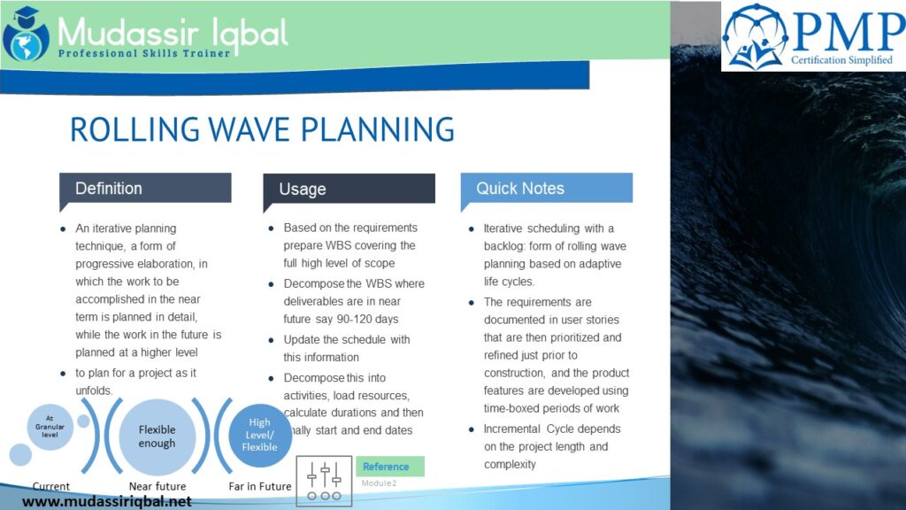 It’s important to note that while rolling wave planning can be used in a predictive project life cycle, it is less common than in other methodologies such as Agile and Hybrid, as the predictive methodology is based on having a detailed plan before starting the execution phase.