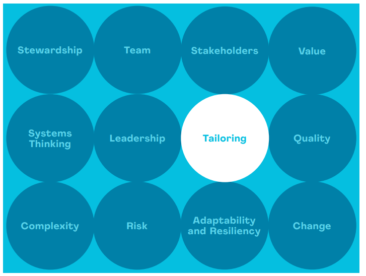 Each project is unique, and project success is based on adapting to the unique context of the project to determine the most appropriate methods of producing the desired outcomes. Tailoring the approach is iterative and is a continuous process throughout the project. Design the project development approach based on the context of the project, its objectives, stakeholders, governance, and the environment using “just enough” process to achieve the desired outcome while maximizing value, managing cost, and enhancing speed.