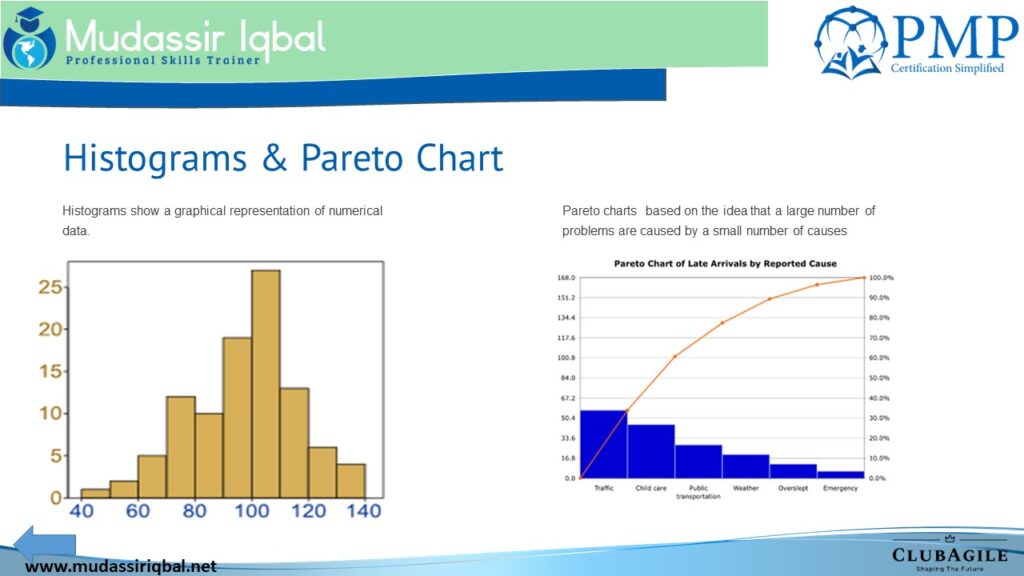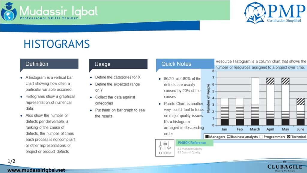 The histogram, the 80/20 rule, and the Pareto chart are all concepts commonly used in project management and quality control.